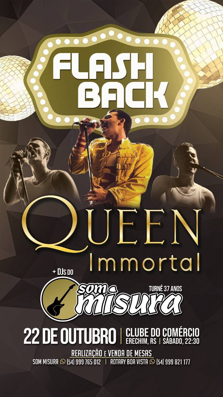 FLASH BACK - Queen Immortal (Curitiba-PR) - é um show imperdível que acontecerá no dia 22 de outubro, às 22h30min, no Clube do Comércio - Erechim - RS. Um momento de descontração, de confraternização, de amizade... Ingressos disponíveis com os companheiros rotarianos.